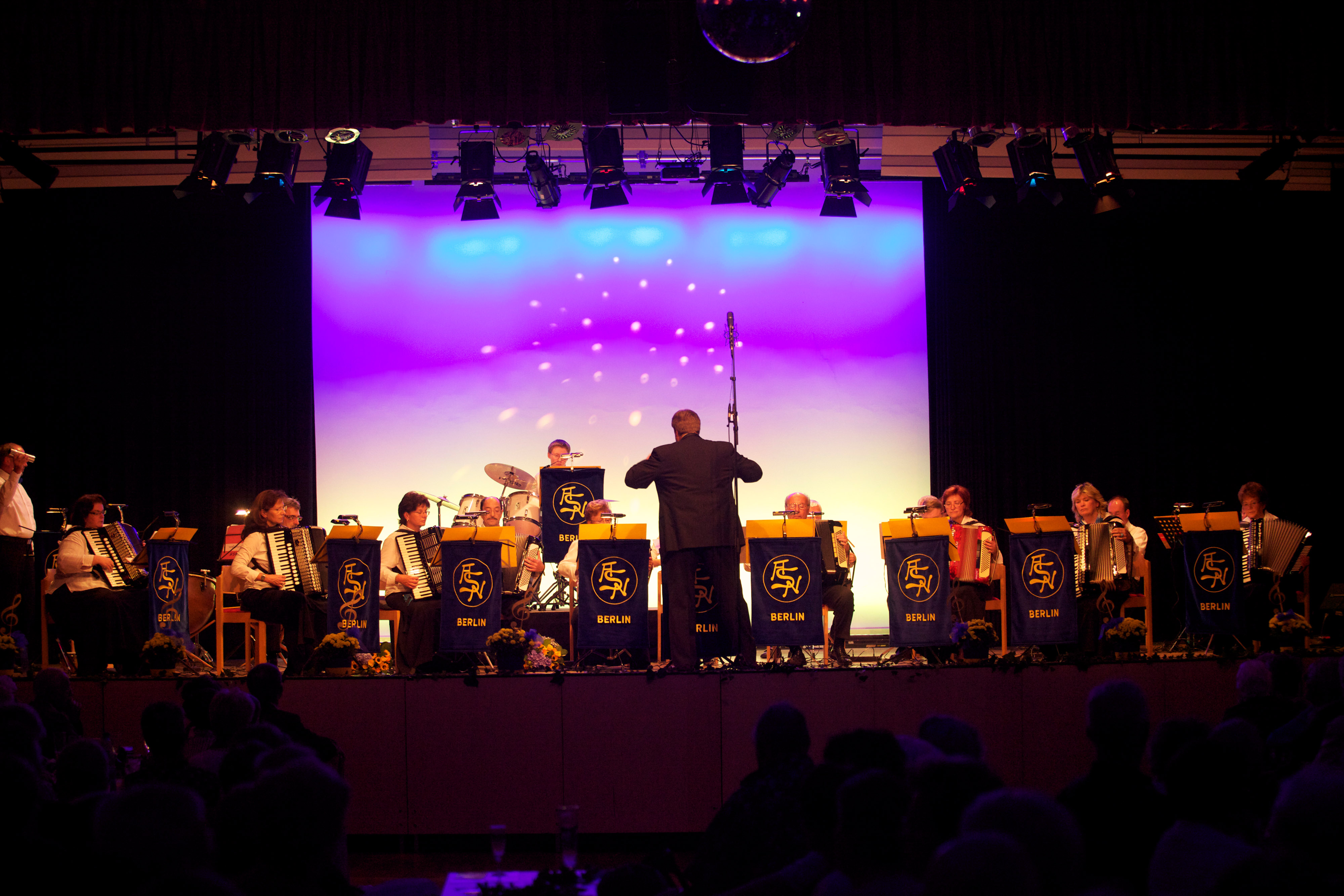 Die Vorbereitungen und Proben fingen bereits im letzten Jahr an. Das Programm wurde zusammengestellt, Solisten angefragt, Probenwochenenden eingeplant, Flyer und Programmhefte erstellt, gedruckt und verteilt, der Saal besichtigt, eine Generalprobe mit dem Theaterleiter vereinbart. Unsere 3 Techniker der Familie Pickert machten sich mit den Bedingungen eines Kinosaals vertraut. Am 25. September war es endlich soweit, das „besondere Konzert“ konnte beginnen. Vor 650 Gästen im großen Saal des Zoo Palastes mit seinem glitzernden Sternenhimmel - ein beeindruckendes Erlebnis - begannen wir mit „Musik ist Trumpf“, arrangiert von Detlev Klatt, seit über 20 Jahren unser musikalischer Leiter. Über einen Gast haben wir uns ganz besonders gefreut, Ingrid Moser, die zu den Gründungsmitgliedern der Akkordeonspielgemeinschaft gehört.
