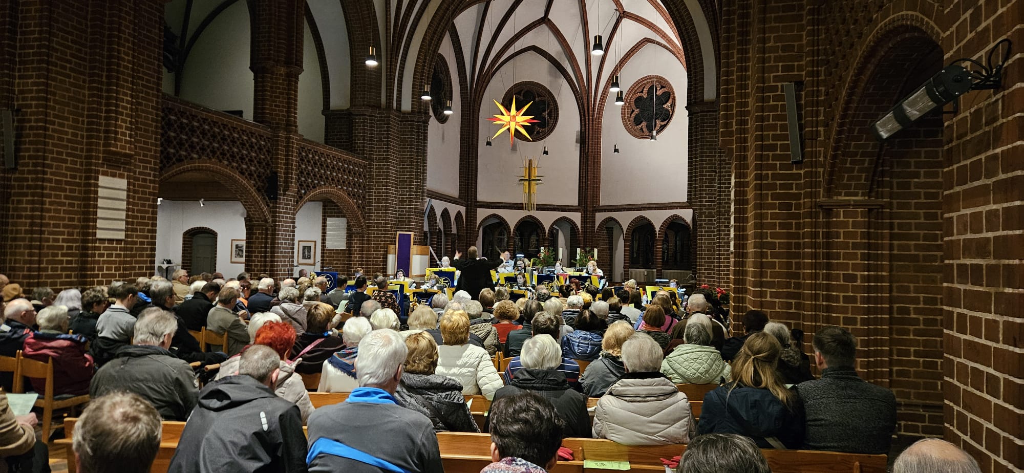 Unser musikalischer Leiter Detlev Klatt hatte ein abwechslungsreiches Programm zusammengestellt, und unser charmanter Moderator Hartmut Mahl bereicherte es mit kleinen Gedichten und Geschichten. In diesem Jahr wurden viele traditionelle Weihnachtslieder gespielt, die zum Mitsingen ermunterten und so lagen in den Reihen Textzettel auf den Plätzen und das Publikum sang sehr gern mit. Das Konzert endete mit der gewaltigen „Orgel Paraphrase”, wobei die Keyboard Orgel beeindruckend in der Kirche nachhallte.