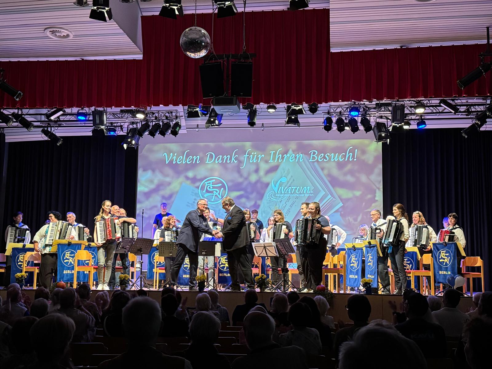 Am 20. September 2025 lud das Akkordeonorchester ASN-Berlin e. V. zu einem besonderen Konzert in den Großen Saal des Gemeinschaftshauses Gropiusstadt ein. Unter dem Motto „Melodien, die verbinden” erklangen zahlreiche Werke voller Spielfreude - gemeinsam mit dem Gastorchester Vivatum e. V.! Wie gewohnt hatte Dirigent Detlev Klatt ein abwechslungsreiches Programm zusammengestellt, das das Publikum von den ersten Takten an in seinen Bann zog. Mit Charme und heiteren Anekdoten führte Moderator Hartmut Mahl durch den Abend.