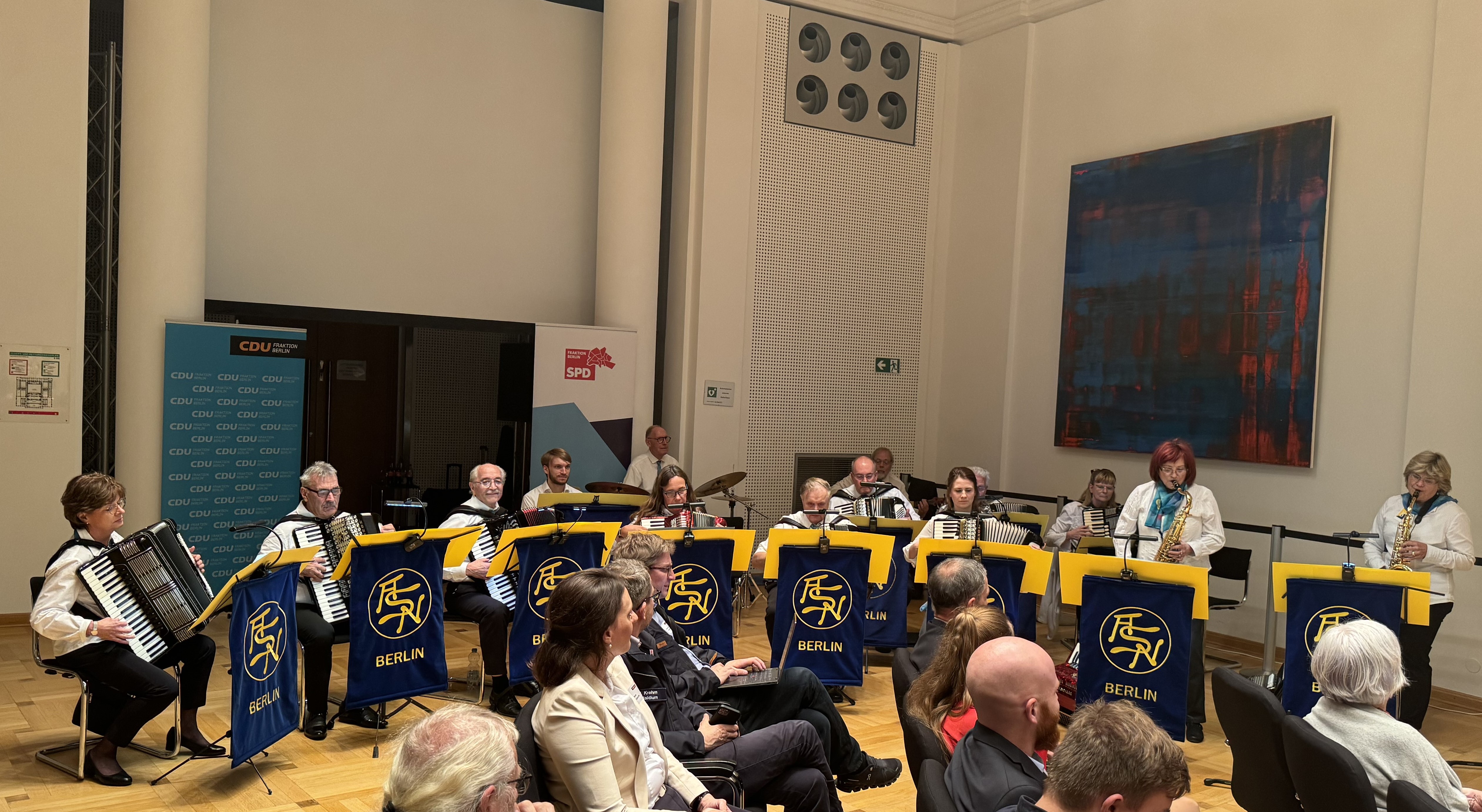 Der Ausschuss für Kultur, Engagement und Demokratieförderung hat unser Akkordeonorchester ASN-Berlin anlässlich einer Dialogveranstaltung zum Thema „Engagiert in Berlin” eingeladen, das Rahmenprogramm für die Diskussionen und Gespräche zu gestalten. Ausgesprochen freundlich und aufmerksam wurden wir empfangen und versorgt. Vor einem Publikum, das aus ehrenamtlichen Mitbürgerinnen und Mitbürgern aus allen Bereichen des Engagements bestand, präsentierten wir schwungvolle Melodien, die begeistert aufgenommen wurden. Nach unserem Herbstkonzert spielte Gabriel Vogel mit dem Instrument des Jahres, der Tuba, zum zweiten Mal mit.
