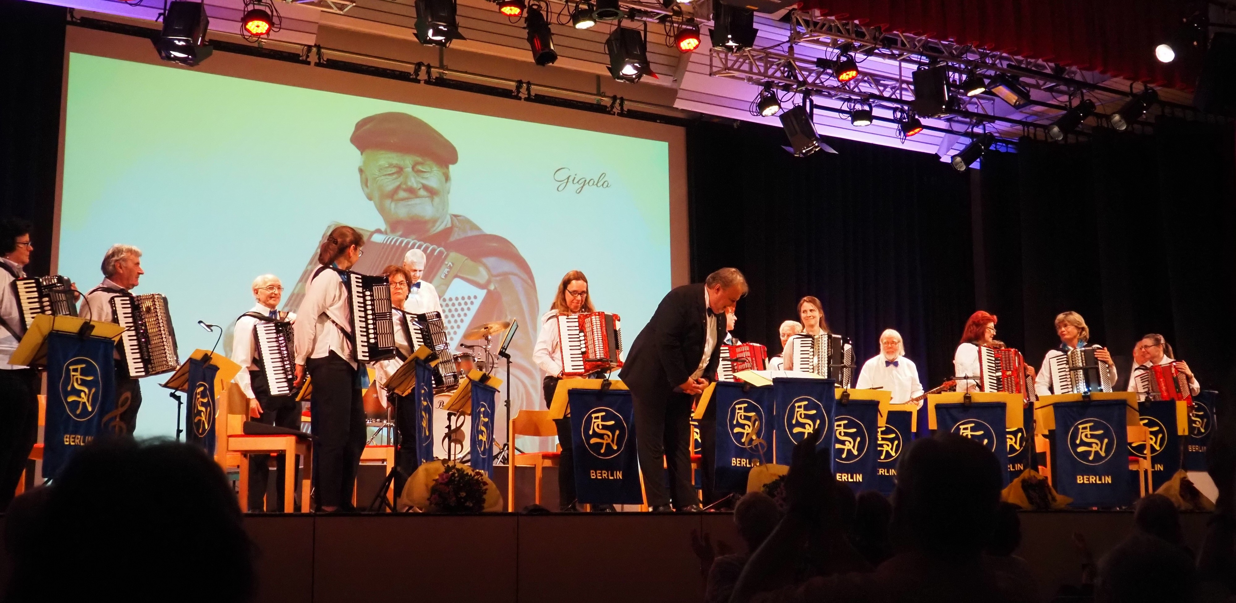 Das Programm war ein Querschnitt durch viele Genres, bekannte und weniger bekannte Melodien. Unser Motto lautete: „Musik ist Trumpf!“ Der Titel von Heinz Gietz aus der legendären Samstagabendshow mit Peter Frankenfeld eröffnete den musikalischen Spätnachmittag. Mit einem Medley bekannter Titel von George Gershwin ging es weiter zu Tango, Bolero, Filmmusik und dem französischen Chanson „C’est si bon“. Den ersten Teil des Konzertes beschlossen wir mit „Eau de Berlin“, bekannte Berliner Melodien zum Mitsingen, arrangiert für das Akkordeonorchester von unserem langjährigen Mitglied Gerhard Rott.
